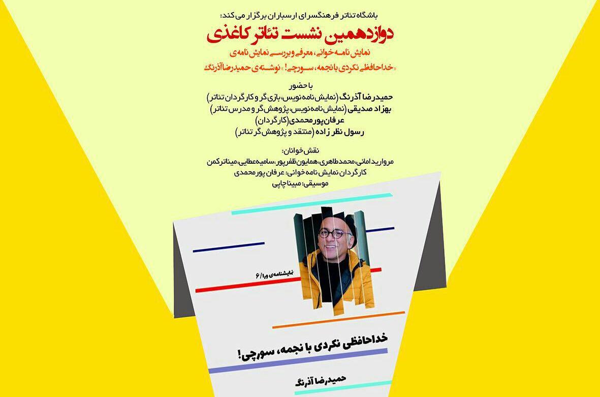 به گزارش روابط عمومی مؤسسه ی افرامانا، در دوازدهمین نشست تئاتر کاغذی ابتدا نمایش نامه ی «خداحافظی نکردی با نجمه، سورچی!» نوشته ی حمید رضا آذرنگ به کارگردانی عرفان پورمحمدی نمایش نامه خوانی می شود و سپس این اثر با حضور مهمانان این نشست مورد بررسی قرار می گیرد.
