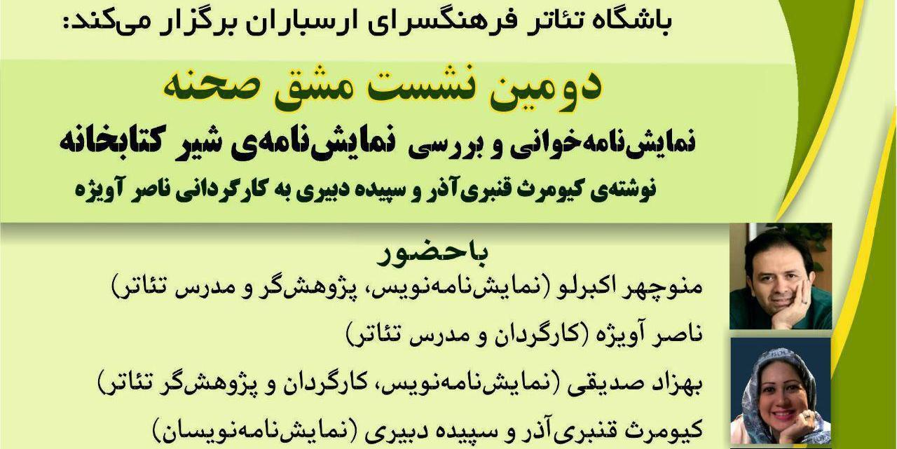 بر اساس این گزارش، در این نشست مشق صحنه که با حضور کیومرث قنبر آذر، ناصر آویژه، منوچهر اکبرلو و سپیده دبیری و بهزاد صدیقی برگزار می شود، ابتدا نمایشنامه ی شیر کتابخانه نوشته ی کیومرث قنبر آذر و کارگردانی ناصر آویژه نمایشنامه خوانی می شود و سپس این اثر با حضور مهمانان این نشست مورد بررسی قرار می گیرد.
