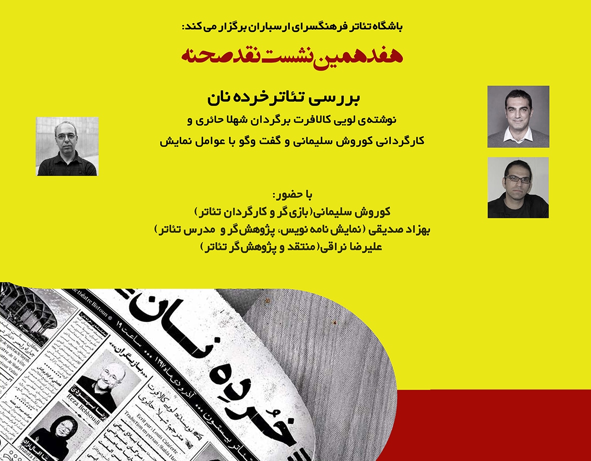 در هفدهمین نشست نقد صحنه، تئاتر خرده نان نوشته ی لویی کالافرت با ترجمه ی شهلا حائری و کارگردانی کوروش سلیمانی ساعت ۱۸ روز شنبه 24 آذر ماه ۹۷ در سالن استاد ذوالفقاری فرهنگسرای ارسباران مورد بررسی قرار می گیرد.